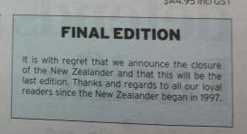 The current issue of The New Zealander newspaper is the last – as announced by the publisher in a notice next to the masthead. I’m sorry to see this as special interest, niche and foreign titles are important to us.