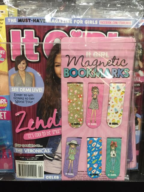 I like the bookmark gifts with the latest issue of It Girl magazine. The gift is slim and does not hinder display of the host product. It encourages reading. The designs suit the target shopper. Kudos to everyone involved in selecting gift to accompany It Girl. Newsagents: have the full cover on show to leverage the gift in-store.