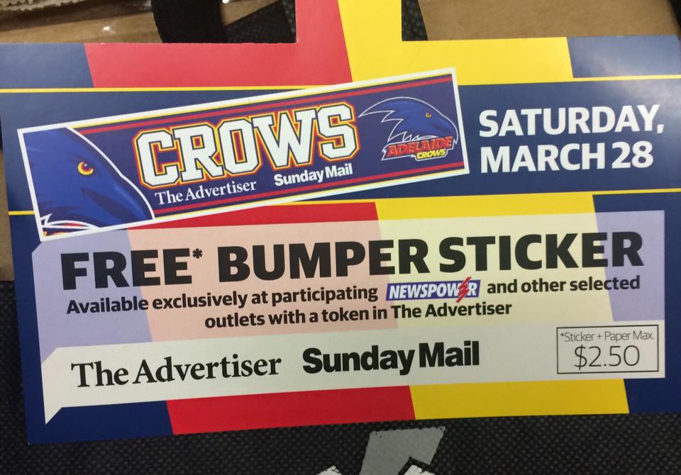 Check out the ad in the Adelaide Advertiser promoting a Crows sticker. What the ad does not say is that it’s available in all newsagents. Promoting Newspower is disrespectful to other SA newsagents – branded and unbranded.