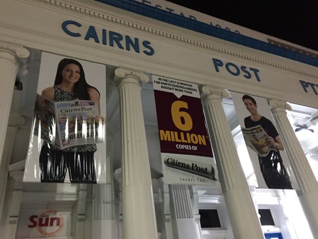 In Cairns last night I was thrilled to see News Corp’s Cairns Post proudly promoting that they have sold 6 million copies of the newspaper in the last year. This promotion speaks to locals and tourists about the position of the title in the community. I see plenty of publishers use their offices to promote websites and Apps – I’m pleased to be able to recognise good promotion of a print product.
