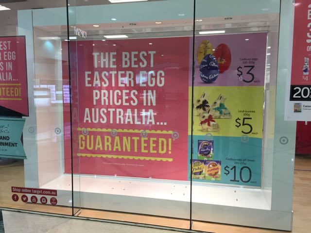 In the main window of a Target stop on the weekend was a large sign promoting that they guarantee the best Easter egg prices in Australia.