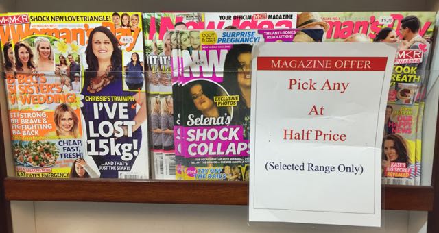 Selling old magazine issues ·April 7, 2015 ·Mark Fletcher ·0 Comments This photo is from the same store as the previous post – a general store in a Fijian resort. They are selling old issues of magazines at half price – because they can’t return them? I can see old issues selling in Fiji. Good luck to them. 2 likes magazines Leave a Reply Cancel replyYour email address will not be published. Required fields are marked *Name * Email * Website Enter Code * Captcha Comment * Δ Post navigation Next ArticlePrevious Article