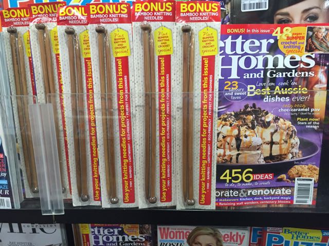 The photo shows how we have the current issue of Better Homes and Gardens magazine on display in the usual location for the title. Fanning the title out this way across two pockets leverages the knitting needle gift – our sales are strong.