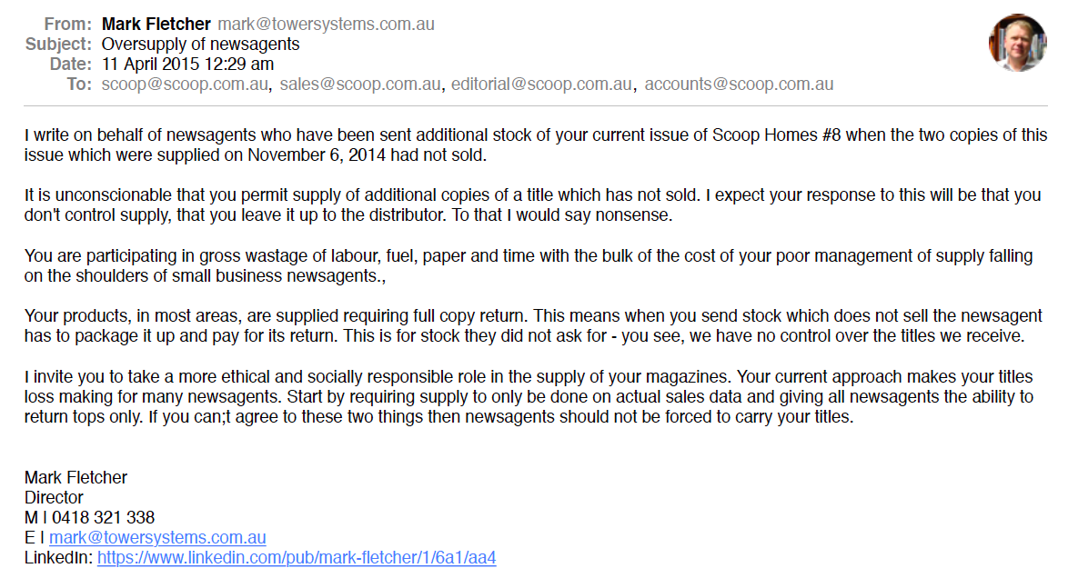 Over the weekend I emailed several contact points at Scoop about their oversupply as I wrote about here last week. The email speaks for itself. I wrote it because I’m of the view we need to hold publishers account for the oversupply we are hit with given that magazine distributors have done little to address the problem. The Scoop example is a simple one to use as there was no evidence in the sales data whatsoever warranting additional stock to be supplied to the example newsagency.