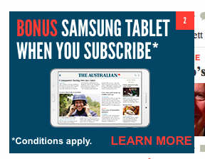 Like many major News Corp. dailies, The Australian is promoting a free tablet computer as a gift with a 12-onth digital subscription. The ad pops up when you go to the website for The Australian – you can’t miss it.