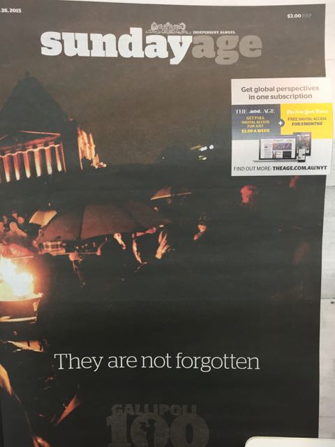 Fairfax trashed a terrific ANZAC themed cover for The Sunday Age only to ruin it with a post-it note ad promoting subscriptions stuck over part of the image. Shame on them for trashing otherwise good ANZAC coverage.