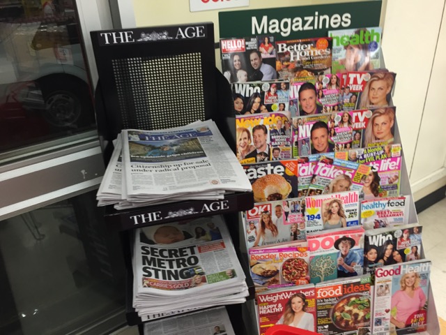 This photo shows a new approach in a Coles supermarket to newspapers and magazines. This stand is located inside the main door with another near a rear checkout and more magazines located in their traditional magazine department.