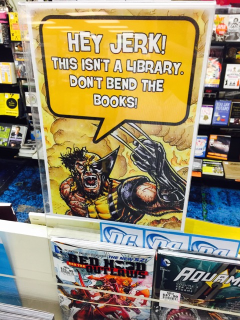 This sign is far better than a dry sign saying don’t damage the books. Sure it is in your face – but in a style appropriate to eh magazines it is placed above.