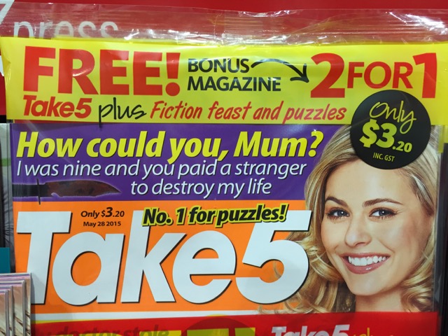 I like the bagged offer with the current issue of Take 5 magazine as it makes sense to me – the inclusion of their Take 5 fiction title as a sampler with the main title. This type of bundling should help grow sales as opposed to some other bundling which makes no apparent sense.