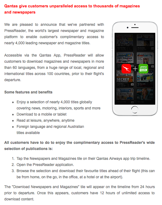 Qantas has announced the availability of easy access to 4,000 newspapers and magazines for up to 24 hours before a flight through a relationship with PressReader. Once you download a title you have access for 12 hours on your device.