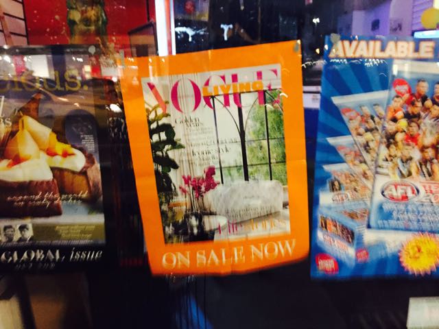 I don’t think putting magazine posters in the window of a newsagency is a good business move – use your window to promote products that differentiate your business. That said, if you must put magazine posters in your window place then straight.