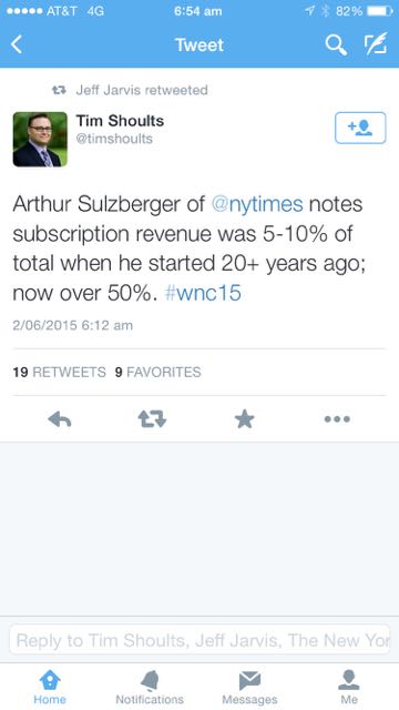 Newspaper subscriptions in the US are important as shown in the tweet about what Arthur Sulzberger, Publisher of the New York Times said at the World News Congress this week. That growth in subscriptions from 5% – 10% 20 years ago to over 50% now is extraordinary.