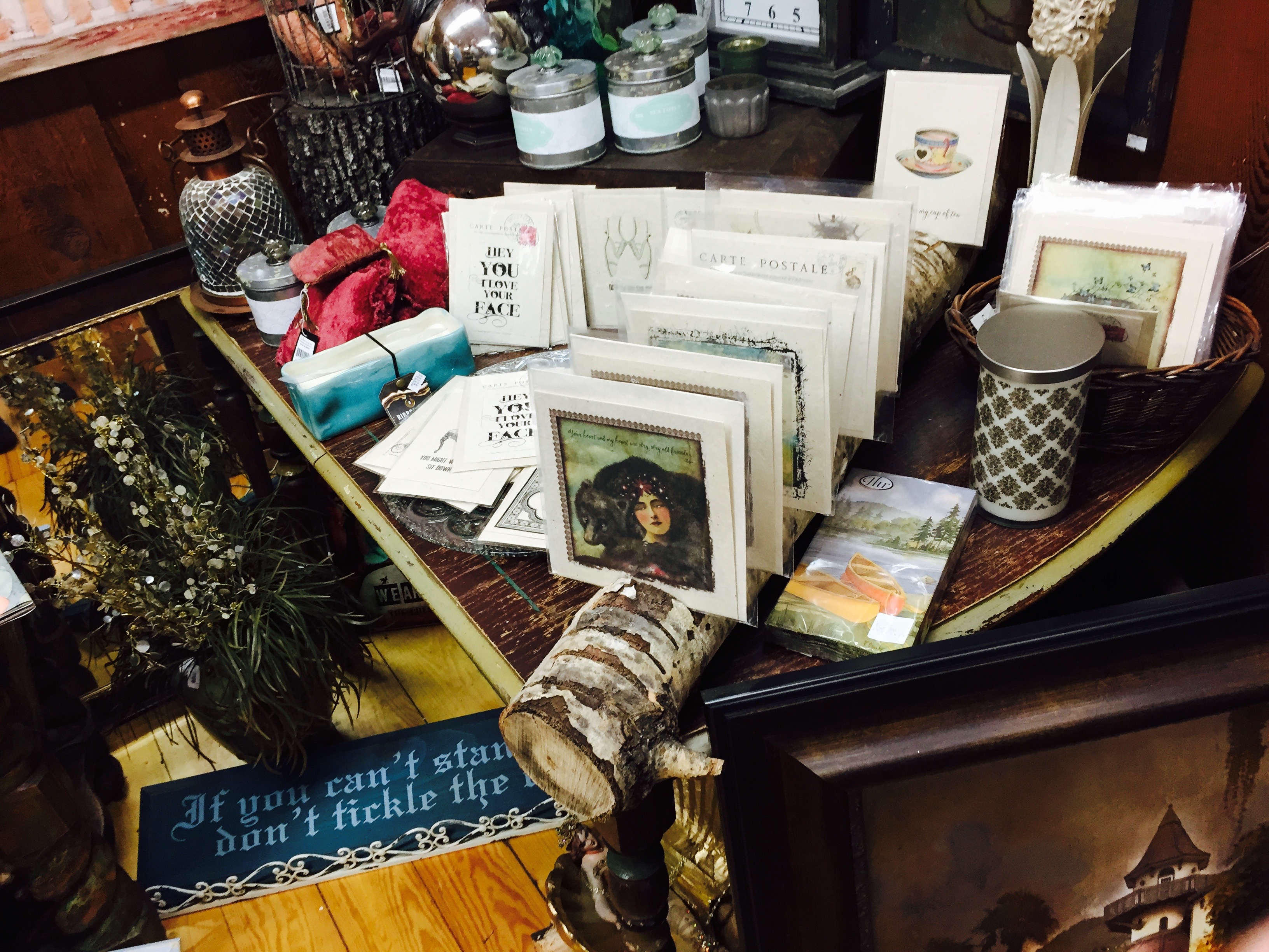 I love this simple yet effective use of a tree brand for featuring greeting cards in a shop I visited this week. They have slices slots into the branch and placed cards in those slots. This is a terrific way you can display cards off location, to attract impulse purchases – since there will be people in the shop for other items who could purchase cards if you disrupt their shop visit with cards presented differently.