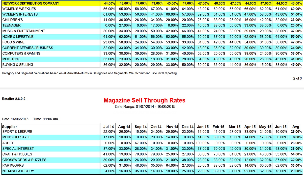 Here is magazine sell through rate data at the MPA category level for Network Services titles supplied to a newsagency.