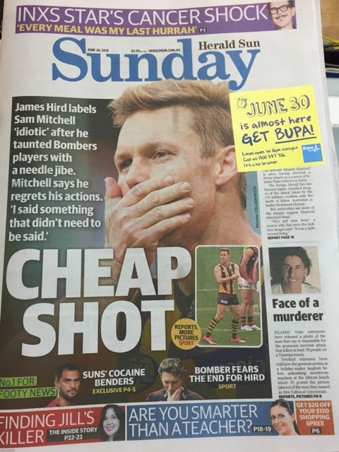 Sunday Herald Sun covers the news ·June 28, 2015 ·Mark Fletcher ·0 Comments I am disappointed to see an ad stuck on the front page of the Sunday Herald Sun today, partially obscuring news. So much for news being important. This type of ad leads to litter, covers news and disrespects the masthead in my view. 0 likes newspaper masthead desecration Leave a Reply Cancel replyYour email address will not be published. Required fields are marked *Name * Email * Website Enter Code * Captcha Comment * Δ Post navigation Next ArticlePrevious Article