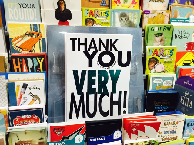 Card shops I have seen in the UK and the US have large cards on a spinner in mid and high traffic locations that are far more noticeable than is usually the case in Australian newsagencies. They also have a bigger range of designs.