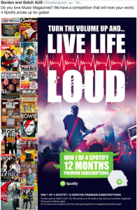 Magazine distributor Gordon and Gotch took to Twitter yesterday promoting a competition encouraging entries explaining why people like one of the magazines listed. Up for grabs is a Spotify premium subscription.
