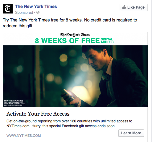 I am seeing this ad promoting subscription to the digital edition of The New York Times come up plenty of times on Facebook at the moment. I am surprised at the considerable marketing efforts in Australia from this US publisher. I think it speaks to the extent of disruption faced by newspaper publishers.