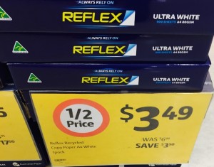 Reflex copy paper is regularly advertised as a brand consumers can trust yet in Coles this week you can see it discounted to below wholesale at $3.49. While the discounting may suit the Coles price positioning strategy, it does not respect the brand nor the retailers who respect the brand.