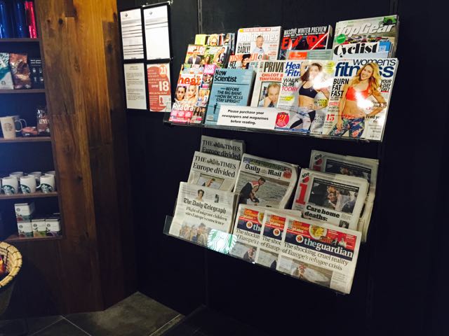 This photo shows the range of magazines and newspapers for sale this morning in a Starbucks in Exeter in the UK – the biggest magazine and paper display I’ve seen in a Starbucks. There are two newsagents within easy walking distance as well as supermarkets.