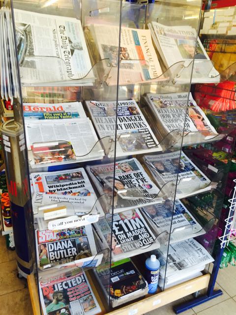 In the village of Lifton in Devon (4 hours from London) Wednesday night, the photo shows how I found the newspaper stand in the one and only shop in town. This stand is in the entrance to the business. Thirteen daily newspapers. Those visiting the shop are point for choice.