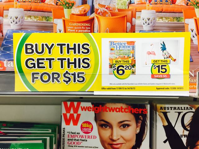 Woolworths has an exclusive offer promoting Better Homes and Gardens at the moment that is confusing. The only promotion I saw in the magazine department was this sign pitching a $20 item for $15 when purchased with the magazine. I can’t work out what the item is.