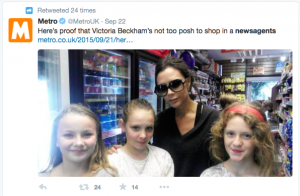 Twitter went a bit nuts two days ago with a photo of Victoria Beckham (Posh Spice from the Spice Girls) shopping in a newsagency with her kids. While not ‘news’ to some, it was news enough to be reported by Metro to its 209,000 Twitter followers. There are more than 300 stories online about this shopping visit.