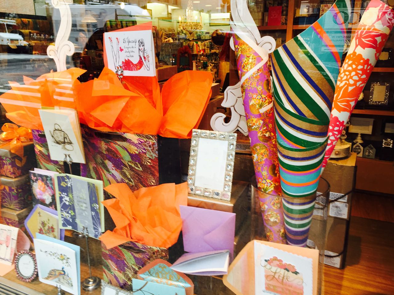 I have seen four or five card shops in New York this week with displays of greeting cards and wrap in their shopfront windows. Yes, they are pitching cards to people on the street. I have written about this several times before – that we ought to promote cards outside the card department, we should use them to drive traffic for our businesses. A display like you can see in this photo pitches the shop as a card specialist whereas a spinner of cards does not.