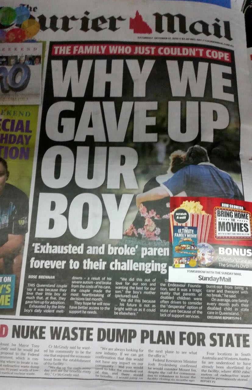 Shame on those at News Corp. involved in the decision to place an ad promoting the Courier Mail over the top of the heart wrenching page-one story of the parents who gave up their one for adoption. What is more important – news or a newspaper promotion? Sure, it is a chicken or egg question. However, since News Corp. invests millions in preaching to Australians on a range of matters, telling us daily what to think, it is reasonable to expect their own behaviour to be better than this. Shame on those involved.