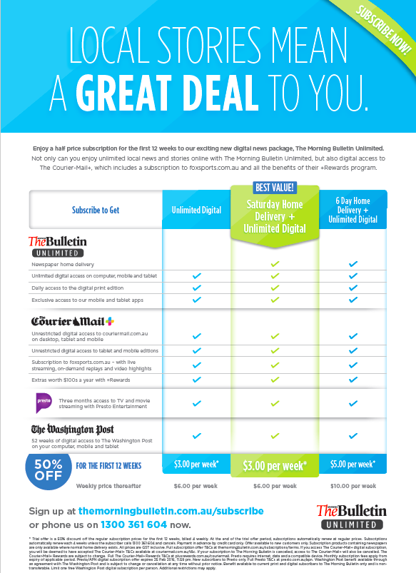 Here is an ad promoting The Morning Bulletin digital pitch to the Rockhampton region. Like with the Daily Mercury pitch I wrote about yesterday, if you take the deal at the 50% off price you get free access to News Corp. content.