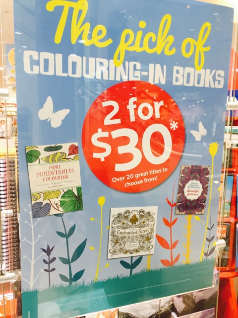 Dymocks is pitching two adult colouring titles for $30. As the poster in the photo notes – shoppers can choose from 20 different adult colouring titles.