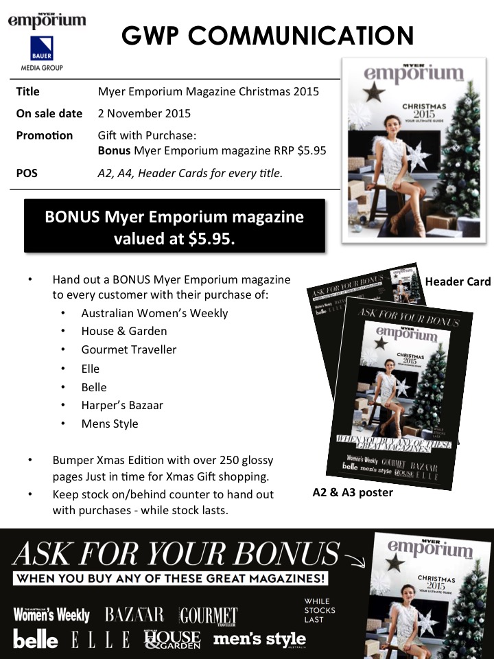 Here is the flyer to which I referred here yesterday from Bauer Media provided to newsagents asking them to promote a Myer department store sales catalogue in their newsagencies, a catalogue that promotes items newsagents sell. Bauer is not paying newsagents the traditional margin of $1.4875 for handing out this ‘publication’.