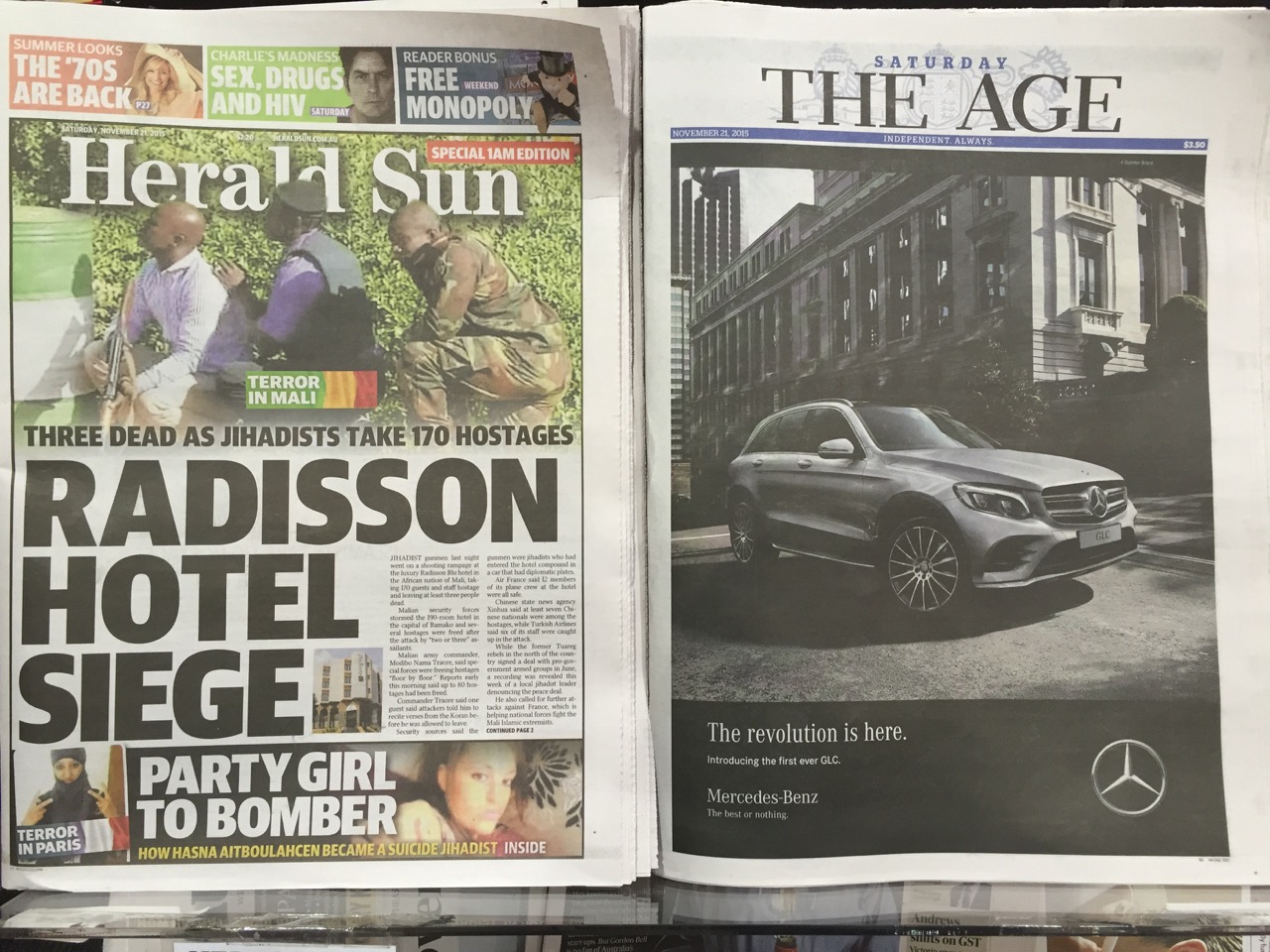 The real question that Fairfax, News and the other newspaper publishers need to answer is whether they are producing newspapers with the goal to sell more newspapers (in which case the headlines and front page stories and stuff are the most important) or to get more money from advertisers (in which case sticking post-it-note ads on the front page or increasing the amount of front page space devoted to ads is the way to go)