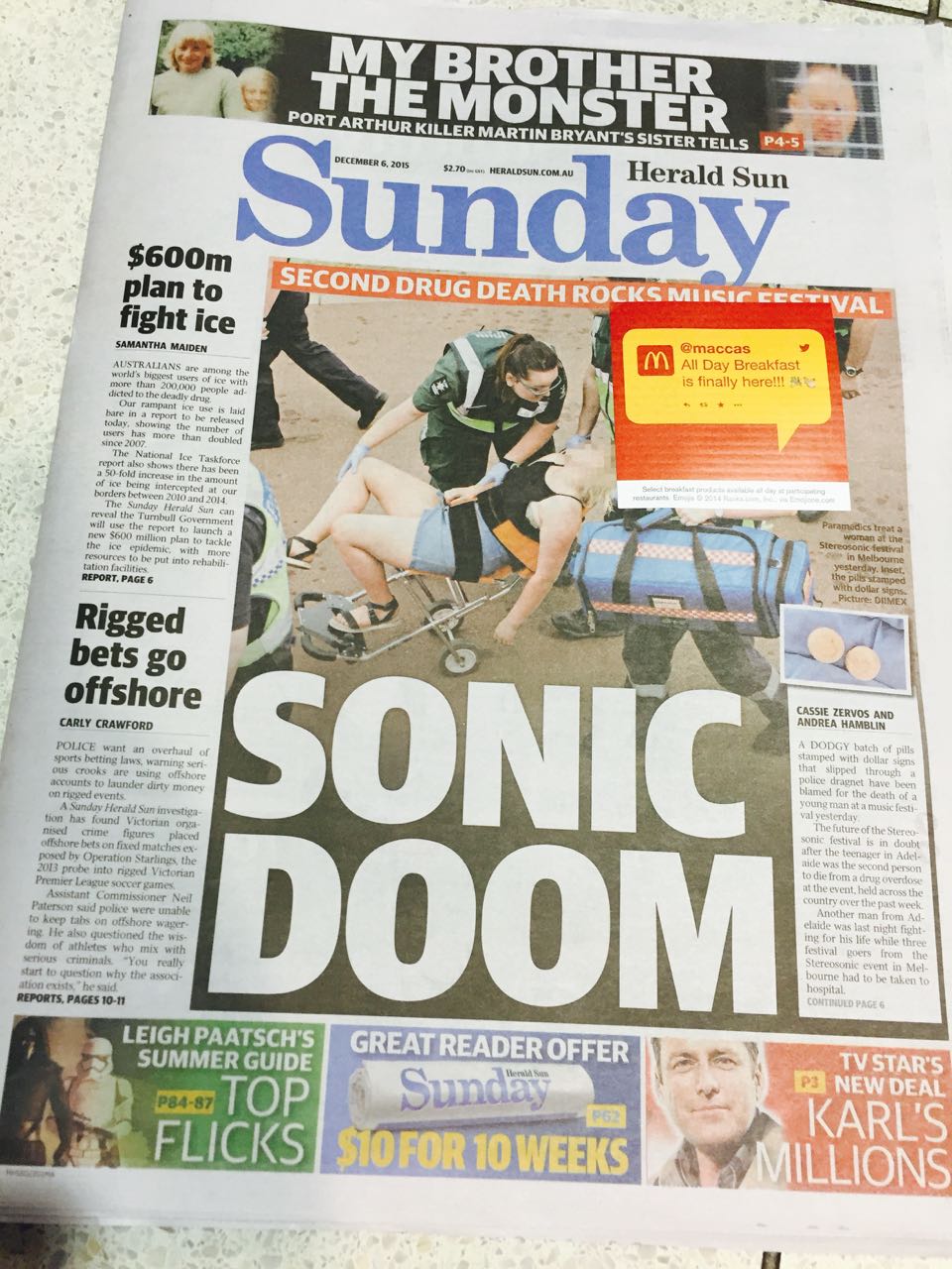 Herald Sun McDonalds cover-up ·December 6, 2015 ·Mark Fletcher ·0 Comments The Sunday Herald Sun today is more interested in making money from a stock on McDonalds ad than the top story of the day. Another sad day for news coverage by newspapers in Australia. 5 likes newspaper masthead desecration Leave a Reply Cancel replyYour email address will not be published. Required fields are marked *Name * Email * Website Enter Code * Captcha Comment * Δ Post navigation Next ArticlePrevious Article
