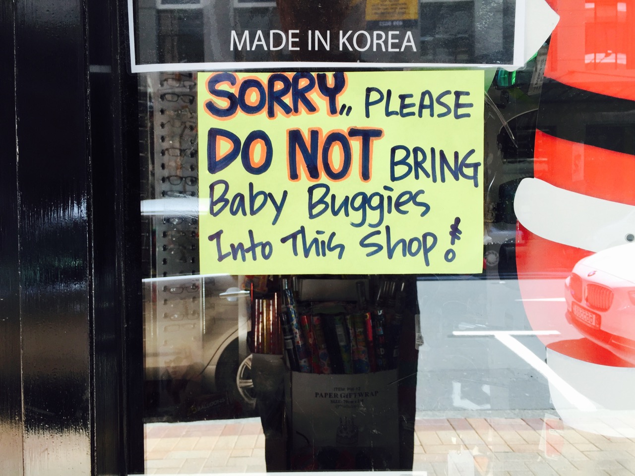 I have no problem with prams and strollers coming into the shop. The thing that puts my heart in my mouth is goffers being driven over my 80 year old wooden floors. I had a customer who was extremely overweight and lost a foot to circulation problems. Every time they came in they’d insist on driving to every corner of the shop and I’d spend the whole time in a cold sweat waiting for the floor to give way.