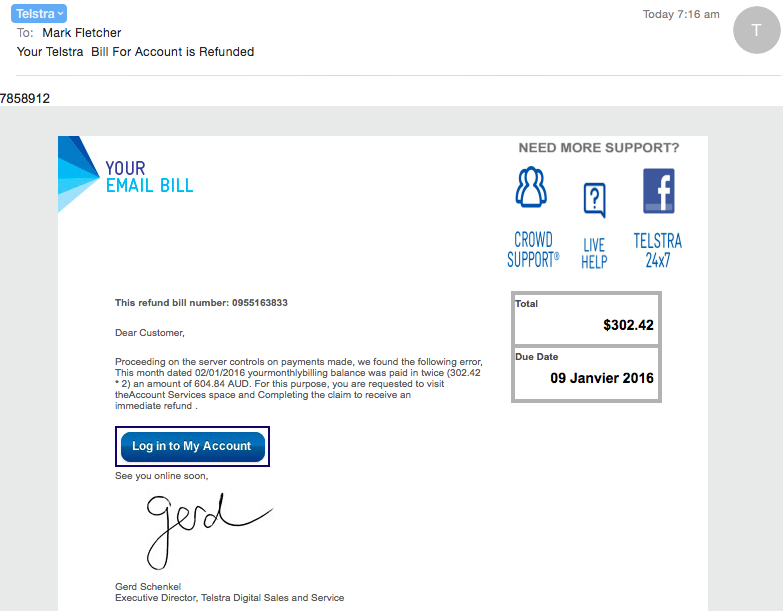 I received this email from telco Telstra several times this week. It is another phishing email, an email that ought to be deleted and not acted upon.