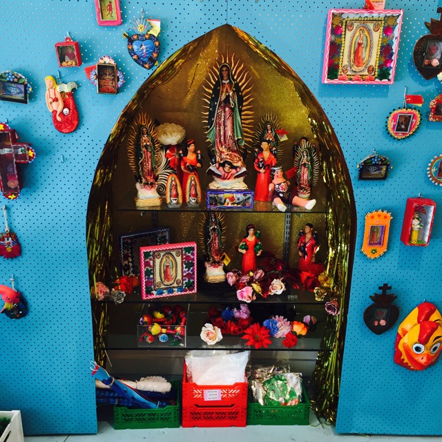 I took this photo in a funky shop last week and share it here as inspiration. To provide focus to some products they created a wall in front of the wall, to make for what looks like a shrine. They lined the cavity with gold paper and painted the new wall a nice contrasting blue. The result was a display you could not miss as you enter the business.