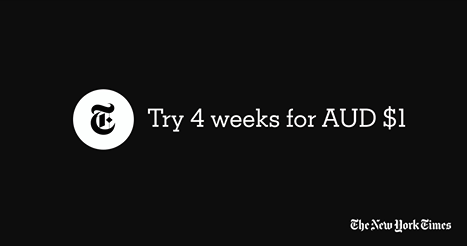 The New York Times Aussie pitch ·January 7, 2016 ·Mark Fletcher ·0 Comments This ad from The New York Times is appearing regularly on Facebook. $1 for a four week trial is a compelling offer. 0 likes Newspapers Leave a Reply Cancel replyYour email address will not be published. Required fields are marked *Name * Email * Website Enter Code * Captcha Comment * Δ Post navigation Next ArticlePrevious Article