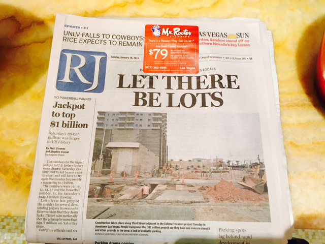 The Las Vegas Review-Journal today (Sunday in the US) has a post-it note ad covering up part of the masthead and editorial designed to drive newspaper sales. The ad is for a business called Mr Rooter so I guess there is karma in that for whoever approved this.