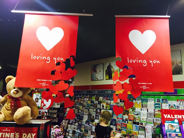 While two posters hanging above the Valentine’s Day display would be good, especially these posters with the simple Loving You message, Chris’ creative efforts have resulted in something far more effective, far more noticeable.