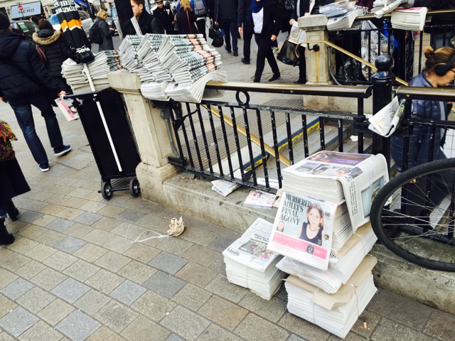 London is a newspaper town. Many daily newspapers are readily available in shops from newsagents to supermarkets. You can’t miss them. Newspapers are readily available for free in the afternoon on street corners. Newspapers are everywhere in London – not only in shops but you can see plenty being read on trains, in the streets and elsewhere.