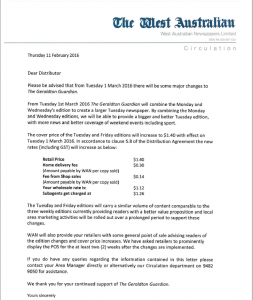 The Monday and Wednesday editions of the Geraldton Guardian are ceasing with a larger Tuesday edition to take their place. West Australian Newspapers has made the announcement to newsagents. handling the attendant data changes will be straightforward for retail newsagents and a bit time consuming for distribution newsagents. I expect we see more changes like this soon in response to circulation challenges.