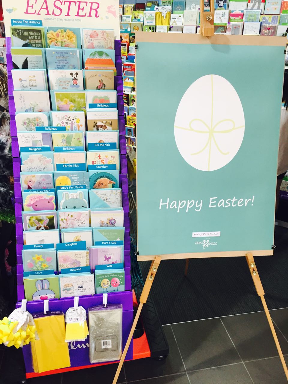 For a while now I have thought that hanging posters is not always ideal. Some seasons lend themselves to a different approach – such as what we are trying with Easter at the front of the newsagency this year.