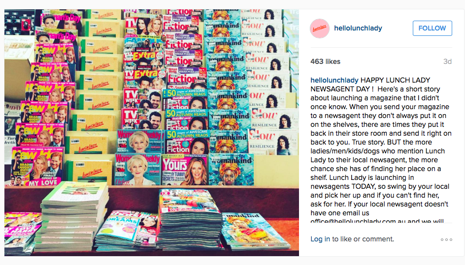 hellolunchladyHAPPY LUNCH LADY NEWSAGENT DAY ! 🍾🍾🍾 Here’s a short story about launching a magazine that I didn’t once know. When you send your magazine to a newsagent they don’t always put it on on the shelves, there are times they put it back in their store room and send it right on back to you. True story. BUT the more ladies/men/kids/dogs who mention Lunch Lady to their local newsagent, the more chance she has of finding her place on a shelf. Lunch Lady is launching in newsagents TODAY, so swing by your local and pick her up and if you can’t find her, ask for her. If your local newsagent doesn’t have one email us office@hellolunchlady.com.au and we will see what we can do about it or check our stockists page – link in profile. Post pictures if you find her and tag so we can see where she has landed! #indiepublishing #askyourfriendlynewsagent