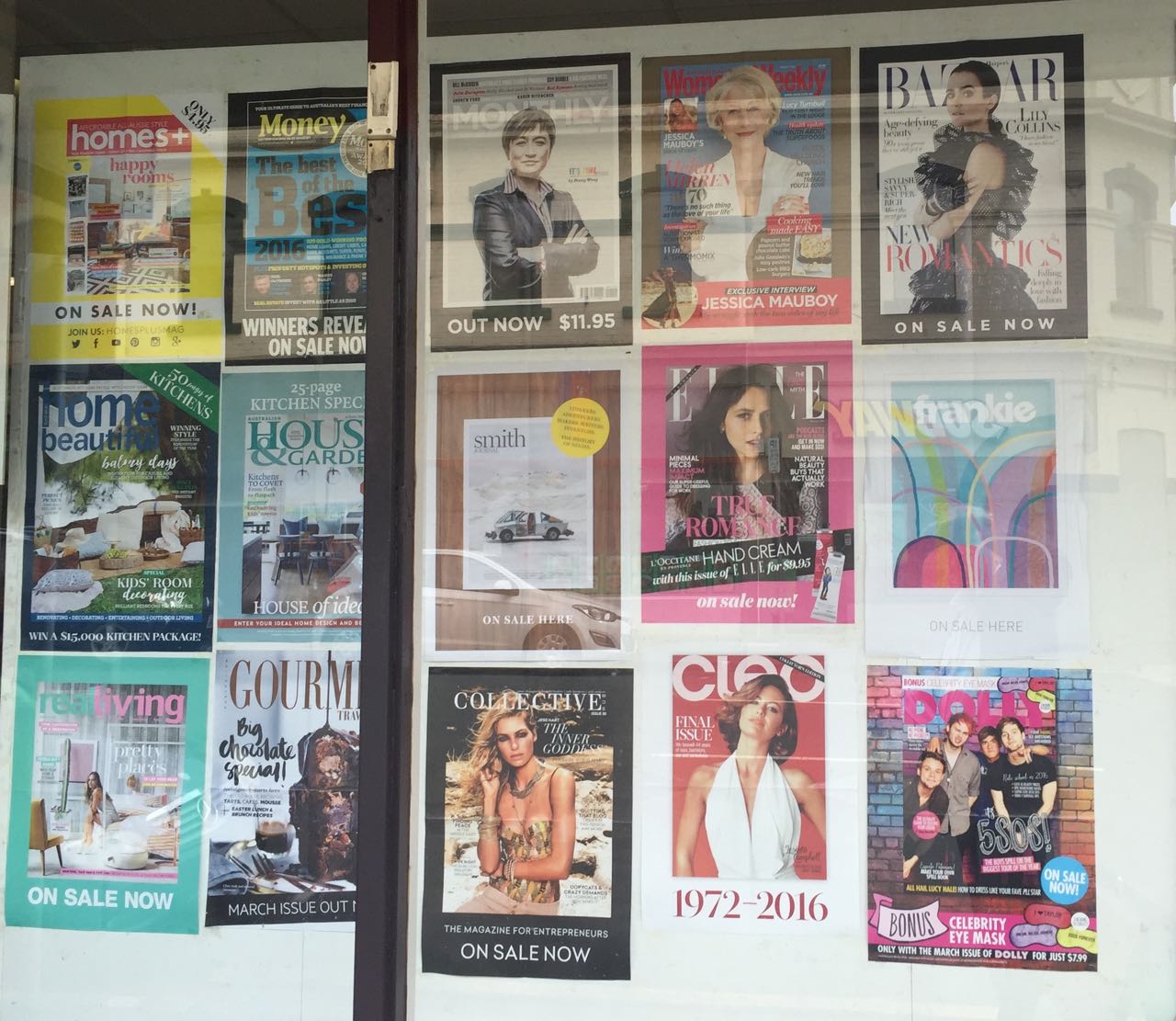 This newsagency front window faces a busy capital city street. It represents a missed opportunity. In this city there are many magazine outlets – newsagencies, supermarkets and convenience stores. This low margin product window display is not pitching a point of difference.