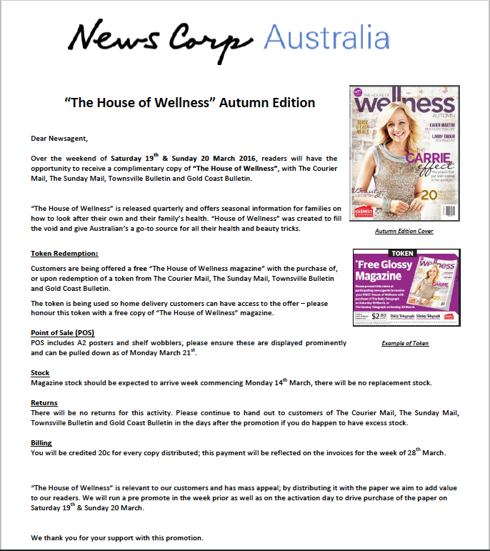 This promotion is on the same day we received and are expected to distribute the “Wellness” freebie, and 24 hours after our distributor “forgot” we were the only shop open in our vicinity on Adelaide Cup day….papers arrived 2 hours and too late.