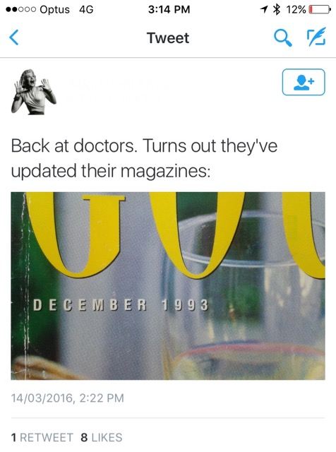 Magazine readership ·March 14, 2016 ·Mark Fletcher ·0 Comments A Twitter friend shared Tweet this with me just now. Made me laugh. A doctor’s surgery with a magazine from 1993! It does make me wonder about readership data given that some magazines can go round and round. 2 likes magazines Leave a Reply Cancel replyYour email address will not be published. Required fields are marked *Name * Email * Website Enter Code * Captcha Comment * Δ Post navigation Next ArticlePrevious Article