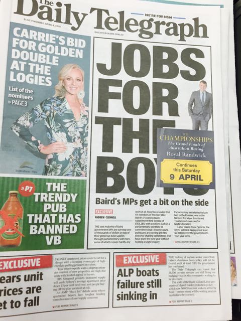 Newspaper page one headline cover-up ·April 5, 2016 ·Mark Fletcher ·1 Comment Yesterday’s Daily Telegraph… Jobs for what?? What a waste of a headline. 2 likes newspaper masthead desecration Join the discussion Neil April 9, 2016 For the boys. It’s not hard to read it… 0 likes Leave a Reply Cancel replyYour email address will not be published. Required fields are marked *Name * Email * Website Enter Code * Captcha Comment * Δ Post navigation Next ArticlePrevious Article