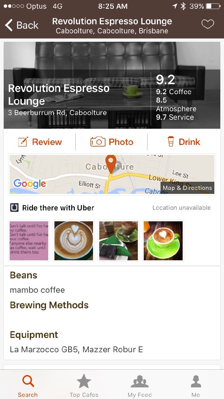 Last week while in Caboolture, Queensland, on business I stopped in at Revolution Espresso Lounge for a coffee. I was guided there by the excellent Beahunter app, an app where coffee lovers rate and write abut coffee shops. With a rating of 9.2 I knew the coffee would be good as Beanhunter members are serious about their coffee.