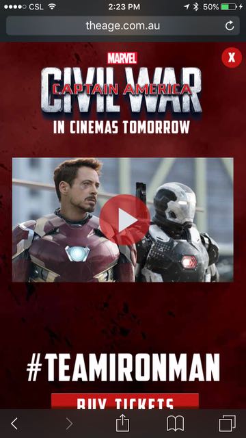 Since I go on (obsess maybe) about the post-it type ads stock over newspaper headlines and mastheads I thought I should comment on this ad that covered access to The Age on my phone yesterday. The thing is, I don’t mind this type of ‘stuck on’ ad as it is easily dismissed, does no damage to the product and barely impacts my experience. I was surprised, however, to see this movie linked to The Age as it’s more Herald Sun product.